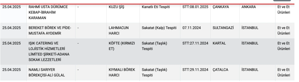 Aynı listede İstanbul’da bir börek ve pide salonunun yaptığı lahmacunda kalp eti olduğu tespit edildi.
