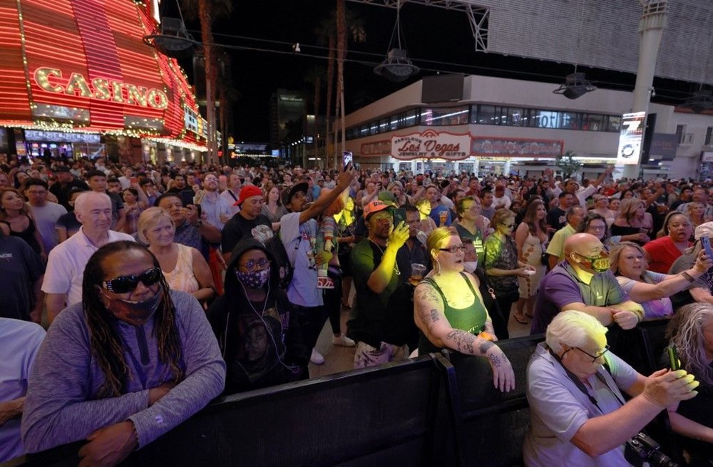 Las Vegas şehir merkezinde halk, dev bir saat, pazartesi gecesi 12:01'e geri sayarken canlı müzik eşiliğinde maske veya sosyal mesafe gerekmeden tamamen yeniden açılmayı alkışladı. Bir sunucu, çoğunluğu maskesiz olan kalabalığa hoparlörden "Bu, Las Vegas tarihinde oldukça önemli bir gece" dedi.