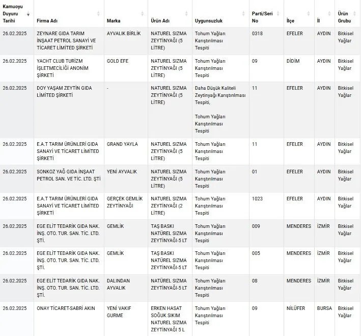 Zeytinyağına tohum yağı karıştıran markalar şu şekilde sıralandı: