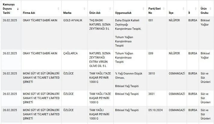 Bakanlık tarafından yayımlanan son listede peynir ürünlerinde yapılan sahtecilik dikkat çekti. Bazı markaların tam yağlı adı altında sattığı peynirlerde belirtilen yağ oranın az olduğu tespit edildi. Vatandaşlar tam yağlı beyaz peynir aldığını düşünerek daha çok para ödüyor.