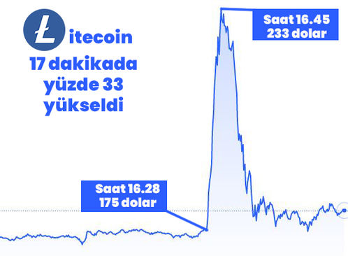 O esnada Litecoin önce 175 dolardan 17 dakikada 233 dolara çıktı, ardından yeniden 178 dolara düştü.