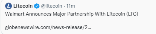 Saat 18.58'de ise Litecoin Vakfı, Twitter üzerinden Walmart ile herhangi bir işbirliğine gitmediğini duyurdu.