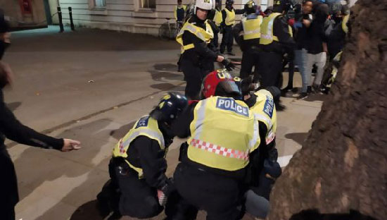 Hyde Park'ta toplanıp yürüyüşe geçen binlerce göstericinin Parlamento Meydanı'na varışının ardından olaylar çıktı. İlk olarak Parlamento Meydanı yakınlarındaki Başbakanlık binası 10 Numara önünde kısa süreli bir arbede yaşandı. Bu sırada bir polis memurunun yumruklandığı görüldü.