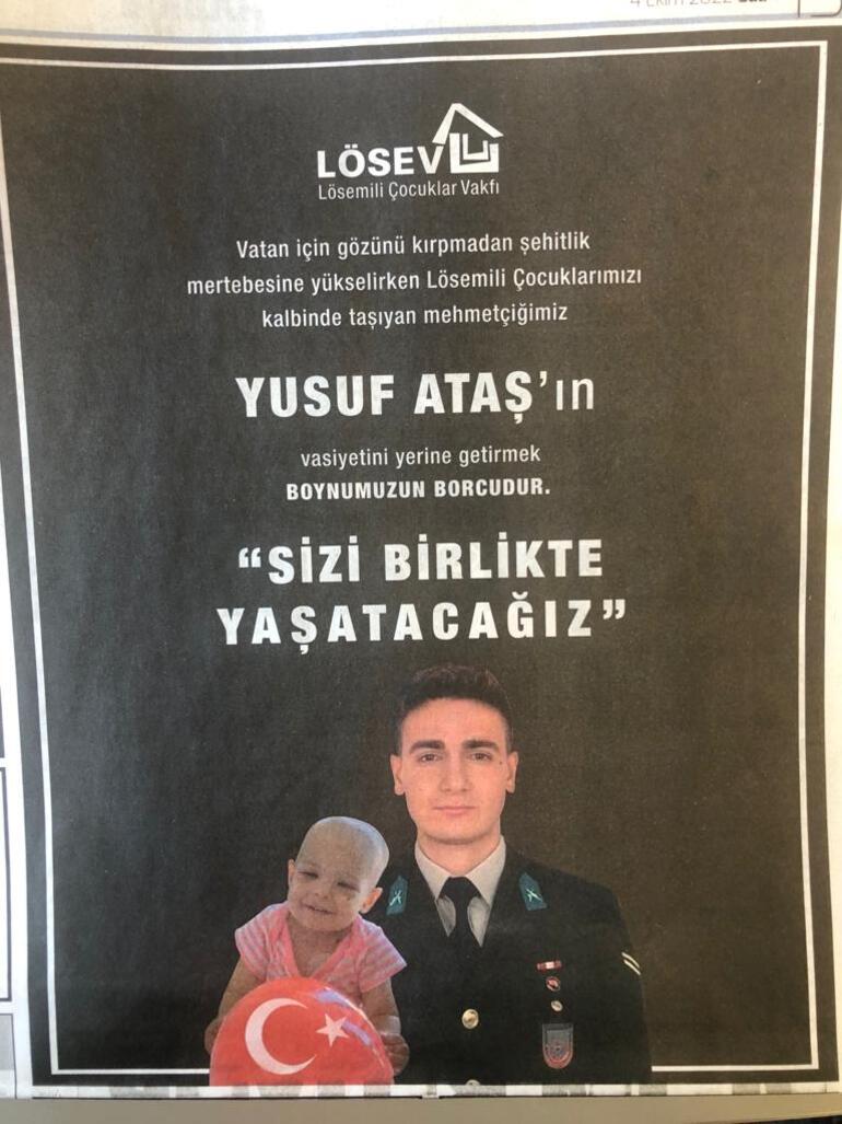LÖSEV tarafından şehit Yusuf Ataş'ın vasiyetiyle ilgili gazeteye ilan verildi. İlanda, "Vatan için gözünü kırpmadan şehitlik mertebesine yükselirken lösemili çocuklarımızı kalbinde taşıyan Mehmetçiğimiz Yusuf Ataş'ın vasiyetini yerine getirmek boynumuzun borcudur" denildi. İlanda ayrıca şehit Ataş ile lösemili bir çocuğun fotoğrafına yer verilerek, "Sizi birlikte yaşatacağız" yazıldı.