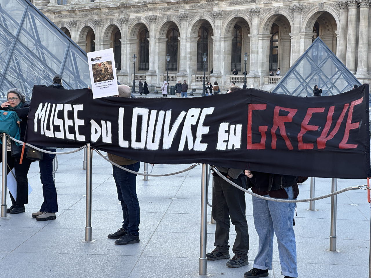 Kötü çalışma koşulları ve güvenlik sorunları nedeniyle greve giden müze çalışanları, Louvre’un önünde toplanarak "Louvre Müzesi grevde" yazılı pankart açtı.