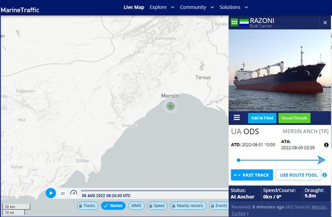 Haber Türk'te yer alan haberde, gemilerin hareketleri ve limanlardaki mevcut konumlarını paylaşan Marine Traffic'in verilerine göre Razoni şu an Mersin açıklarında görünüyor.