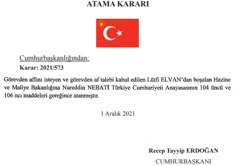 Resmi Gazete'de yayımlanan Cumhurbaşkanlığı kararı ile Hazine ve Maliye Bakanlığı'nda görev değişikliği yaşandı. Yaklaşık bir yıldır Hazine ve Maliye Bakanlığı görevini sürdüren Lütfi Elvan'ın yerine yeni bakan Elvan'ın yardımcısı olarak görev yapan Nureddin Nebati oldu.