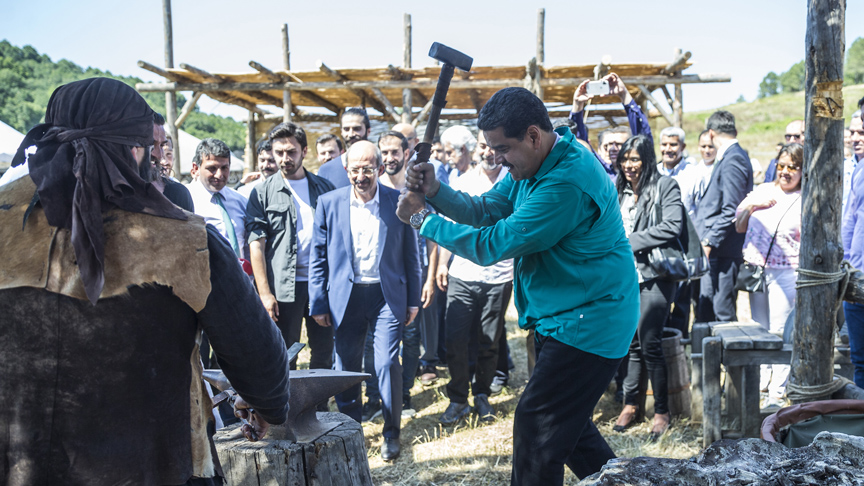 Maduro, eşi Cilia Flores ve beraberindeki heyetle dizinin yapımcısı Mehmet Bozdağ ve yönetmeni Metin Günay'dan dizi ve set çalışmaları hakkında bilgi aldı. Kendisini karşılayan oyunculara dizideki adlarıyla hitap eden ve onlarla şakalaşan Venezuela Devlet Başkanı, platodaki demirci bölümünde demir dövdü.