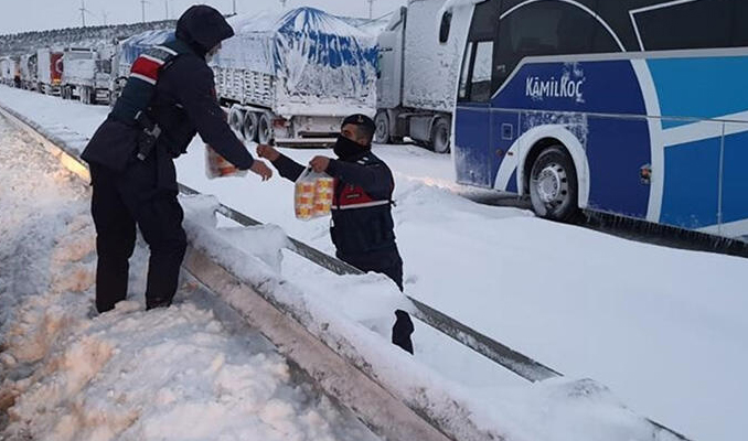 Kendileri gibi yolda kalanlara yardımcı olmaya çalıştıklarını belirten Yıldıztekin, "Kar dünden beri hiç durmadı, araçlar resmen kara gömüldü. Biz de arkadaşımla yaya olarak yola çıktık, insanlara su götürmeye çalışıyoruz." diye konuştu.