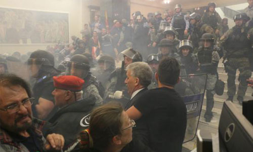 Cumhurbaşkanı Gjorge İvanov tarafından kendisine hükümeti kurma görevi verilmeyen Makedonya Sosyal Demokratlar Birliği (SDSM) lideri Zoran Zaev ve Arnavut partilerinin meclis başkanını seçme girişimi gerginliğe sebep oldu. Makedonya Meclisinde meclis başkanının seçilmesinin ardından çıkan olaylarda 1'i ağır 9 kişi yaralandı.