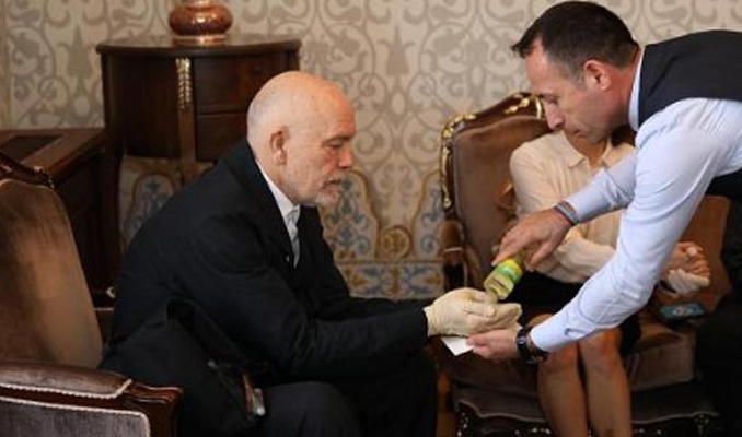 Ziyaret sırasında misafirlere, kolonya ikram edildi. Malkovich'in, dünyayı etkisi altına alan koronavirüs salgınına karşı önlem amacıyla eldiven takması ise dikkati çekti.