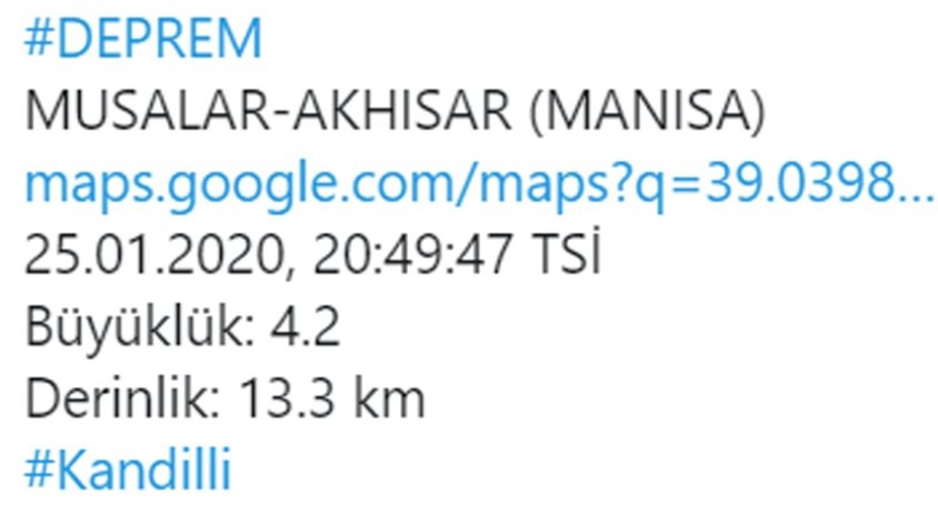 Kandilli Rasathanesi verilerine göre, saat 20.49'da merkez üssü Manisa'nın Akhisar ilçesi ola n 4.2 büyüklüğünde deprem meydana geldi. Sarsıntı yerin 13.3 kilometre derinliğinde gerçekleşti.