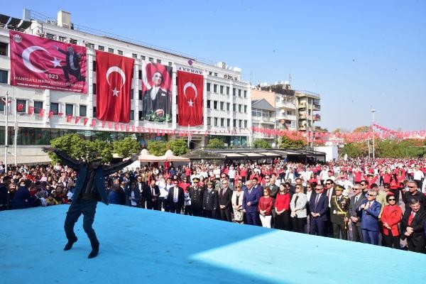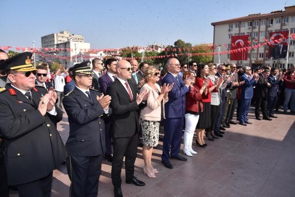 Manisa'da 29 Ekim Cumhuriyet Bayramı coşkuyla kutlanmaya devam ediyor. Sabah düzenlenen resmi programın ardından kutlamalar kapsamında, Valilik ve Büyükşehir Belediyesi öncülüğünde, Cumhuriyet Meydanı'nda '1923 Manisalı Harmandalı oynuyor' adlı etkinliği düzenlendi. Etkinliği, aralarında Vali Ahmet Deniz ve eşi Olcay Deniz, Büyükşehir Belediye Başkanı Cengiz Ergün ve eşi Şeyda Ergün, Manisa 1'inci Komando Eğitim Tugay Komutanı Albay Sebahattin Kalkan ve İl Jandarma Komutanı Tuğgeneral Selçuk Yıldırım ve vatandaşlar birlikte ilgiyle izledi. Harmandalı oyunu öncesi, çeşitli gruplar tarafından halk oyunları gösterileri sunuldu. Daha sonra meydanı dolduran 7'den 70'e her yaştan 1923 Manisalı, Harmandalı oynadı. Harmandalı etkinliğinin sonunda meydanda kurulan Büyükşehir Belediyesi standında ise, 1923 adet Mustafa Kemal Atatürk'ün 'Nutuk' adlı eseri dağıtıldı.
