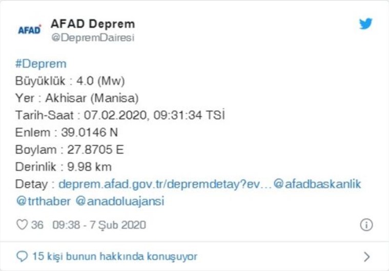 AFAD'dan alınan son dakika bilgisine göre, Manisa'nın Akhisar ilçesinde 4.0 büyüklüğünde deprem meydana geldi. Depremin yaklaşık olarak 10 kilometre derinlikte gerçekleştiği belirtildi.