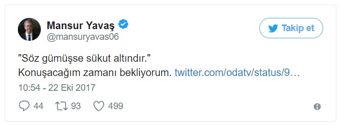 Yavaş, OdaTV'nin "Mansur Yavaş'ın dikkat çeken sessizliği" haberine "Söz gümüşse sükut altındır. Konuşacağım zamanı bekliyorum" diyerek yanıt verdi.