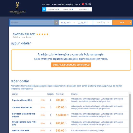 Dünyanın en lüks oteli seçilen ve 1.4 milyar dolara mal olan Antalya’daki Mardan Palace Hotel, resmi internet sitesi üzerinden yaptığı oda satışlarının tamamını durdurdu. Site üzerinden rezervasyon yapılmak istendiğinde “Aradığınız kriterlere uygun oda bulunamamıştır” uyarısı ile karşılaşılıyor.