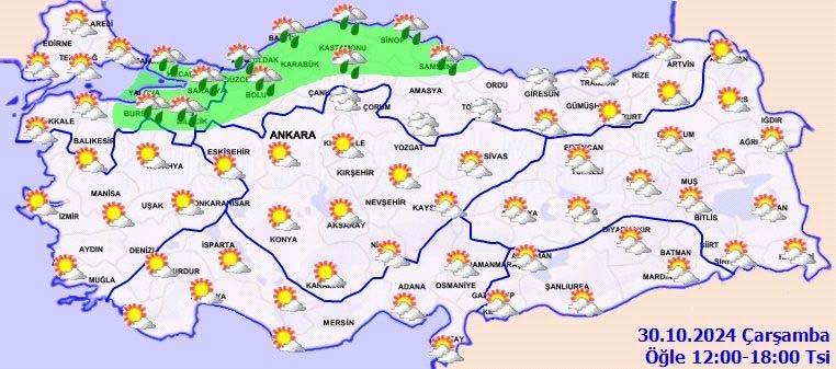 Meteoroloji Genel Müdürlüğü tarafından yapılan son tahminlere göre: Yurdun kuzey kesimlerinin parçalı ve yer yer çok bulutlu, Marmara'nın doğusu, Batı Karadeniz ile Samsun çevrelerinin sağanak yağışlı, diğer yerlerin az bulutlu ve açık geçeceği tahmin ediliyor. Yurdun iç ve kuzey kesimlerinde pus ve yer yer sis hadisesi bekleniyor.