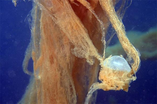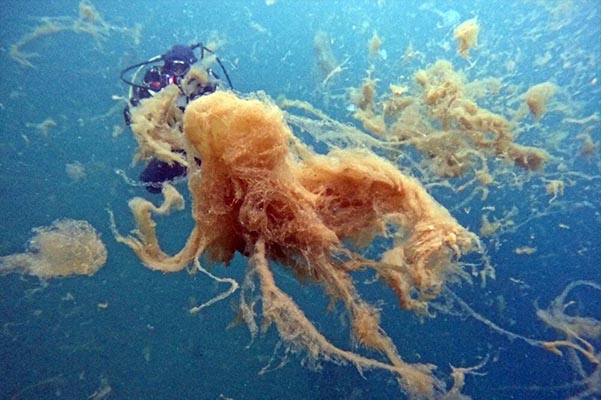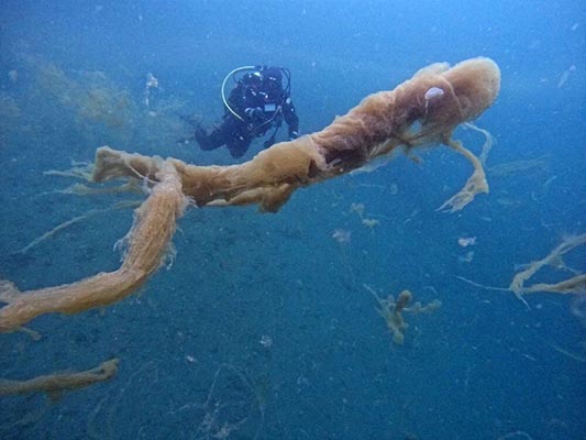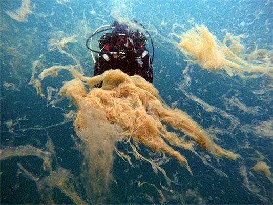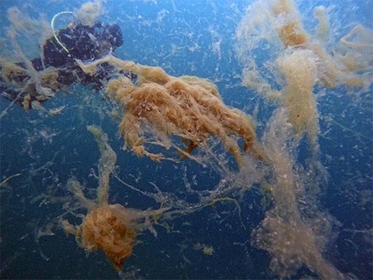 Kocaeli'nin Gölcük ilçesine bağlı Değirmendere'de, su üstünden görünmeyen müsilajın su altındaki yayılımı kaydedildi.