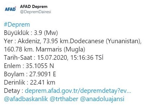 Akdeniz’de Richter ölçeğine göre 3.9 büyüklüğündeki deprem saat 15:15'te meydana geldi. Marmaris açıklarında meydana gelen depremin 22.6 kilometre derinlikte olduğu kaydedildi.