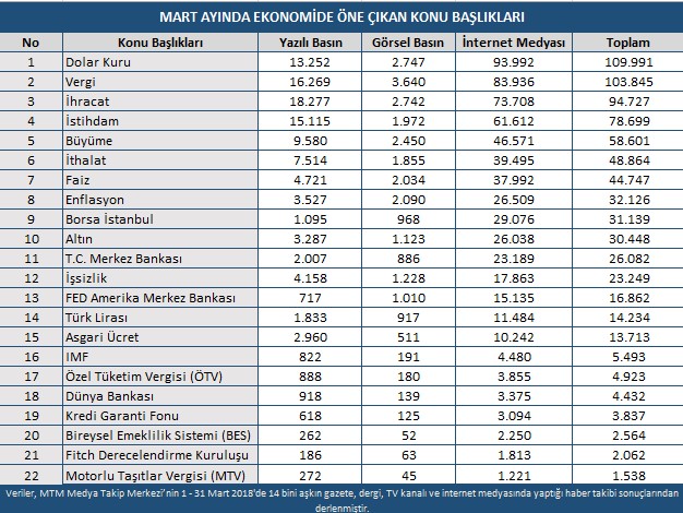 Medya Takip Merkezi, Mart ayı ekonomi karnesini açıkladı. Rapora göre en çok konuşulan ekonomi başlığı, geçtiğimiz ayda olduğu gibi dolar kuru oldu. Dolar, ay boyunca medyada 109 bin 991 haberde yer aldı. Konuşulan diğer bir başlık ise vergi oldu. Maliye Bakanı Naci Ağbal, vergi dairesiyle ilgili işlemleri elektronik ortamda interaktif olarak yapma imkanı getirdiklerini belirtti. 29. Vergi Haftası kapsamında gerçekleştirilen İnteraktif Vergi Dairesi'nin tanıtım toplantısında konuşan Bakan Ağbal, 2017'de vergi gelirlerinde olağanüstü başarı yakaladıklarını söyledi. Mart ayında vergi ile ilgili medyaya 103 bin 845 haber yansıdı.