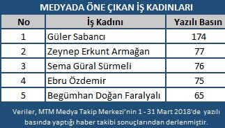 İş dünyasının tanınmış isimlerinden Sabancı Holding Yönetim Kurulu Başkanı Güler Sabancı, medyada hakkında en çok haber çıkan iş kadını oldu. Enerji ve Tabii Kaynaklar Bakanlığı tarafından bu yıl ilki düzenlenen "Türkiye'ye Enerji Veren Kadınlar" Ödül Töreni’nde jüri başkanı olarak katıldı. Sabancı, kadınların yönetsel becerilerine değinerek enerji sektöründe de kadın erkek eşitsizliğinin yaşandığını ifade etti. İş kadını Sabancı, yazılı basında hakkında çıkan 174 haber ile listenin ilk sırasında yer aldı.