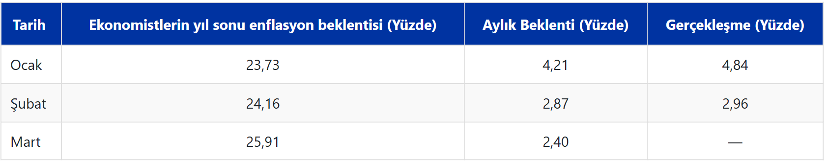 Öte yandan, ekonomistlerin 2026 sonu enflasyon beklentilerinin ortalaması mart ayı itibarıyla yüzde 25,91 oldu. Tüketici Fiyat Endeksi, şubat ayında yüzde 2,96 artış göstermişti.
