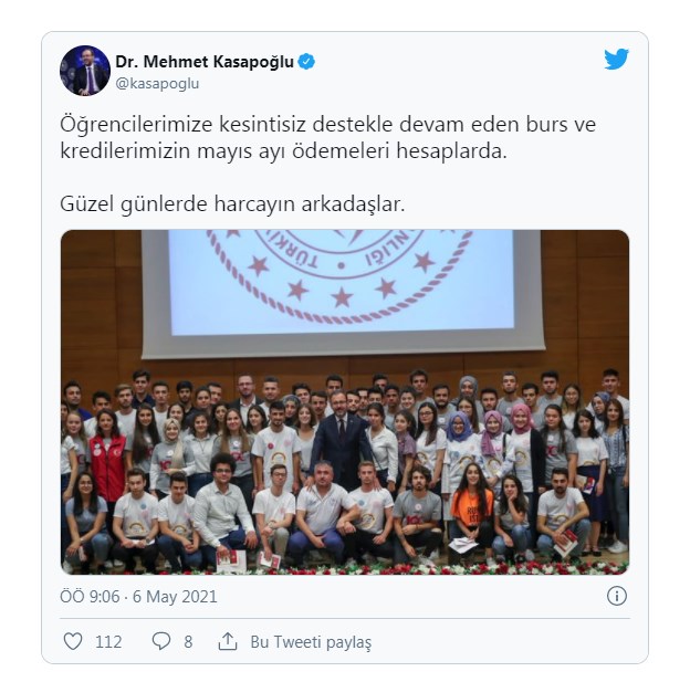Kasapoğlu yaptığı paylaşımda, "Öğrencilerimize kesintisiz destekle devam eden burs ve kredilerimizin mayıs ayı ödemeleri hesaplarda. Güzel günlerde harcayın arkadaşlar" ifadelerini kullandı.