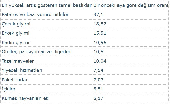 Türkiye İstatistik Kurumu (TÜİK) verilerine göre, patates ve bazı yumru bitkilerin fiyatlarındaki artışı yüzde 18,87 ile çocuk giyimi, yüzde 15,51 ile erkek giyimi ve yüzde 10,56 ile kadın giyimindeki artışlar izledi.