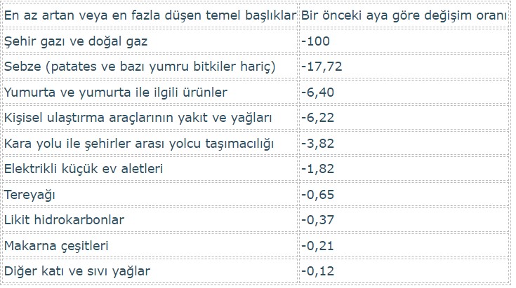 Şehir gazı ve doğalgaz fiyatlarını yüzde 17,72 ile sebze (patates ve bazı yumru bitkiler hariç), yüzde 6,40 ile yumurta ve yumurta ile ilgili ürünler, yüzde 6,22 ile kişisel ulaştırma araçlarının yakıt ve yağları, yüzde 3,82 ile kara yolu ile şehirler arası yolcu taşımacılığı, yüzde 1,82 ile elektrikli küçük ev aletleri, yüzde 0,65 ile tereyağı, yüzde 0,37 ile likit hidrokarbonlar, yüzde 0,21 ile makarna çeşitleri izledi. En az fiyat düşüşü ise 0,12 ile diğer katı ve sıvı yağlar ürünlerinde görüldü.