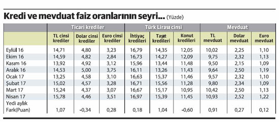 İşte tablo ortada... Merkez Bankası kayıtlarından aktaralım. Nisan ayı itibariyle son yedi ayda TL cinsi ticari kredilerin faizi 1 puandan fazla arttı. Yine TL cinsi olmak üzere ihtiyaç kredilerin faizinde kayda değer bir değişiklik olmadı, ama taşıt kredilerinin faizinde ticari kredilerde olduğu gibi 1 puandan biraz fazla artış görüldü. Konut kredilerinin faizi ise 0.6 puan geriledi.