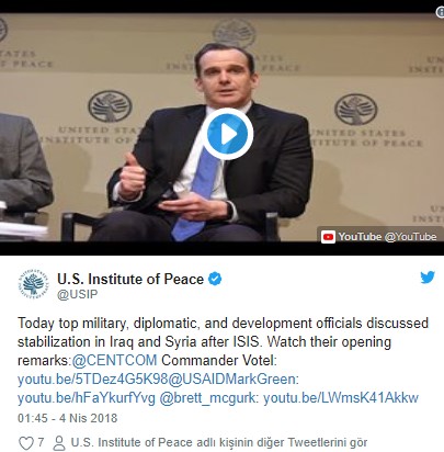 AA'nın haberine göre Orgeneral Votel, Trump'ın IŞİD ile Mücadele Özel Temsilcisi Brett McGurk ve ABD Uluslararası Kalkınma Ajansı Başkanı Büyükelçi Mark Green ile ABD Barış Enstitüsünün düzenlediği "IŞİD Sonrası Irak ve Suriye'nin İstikrarı' konulu panelde konuştu.