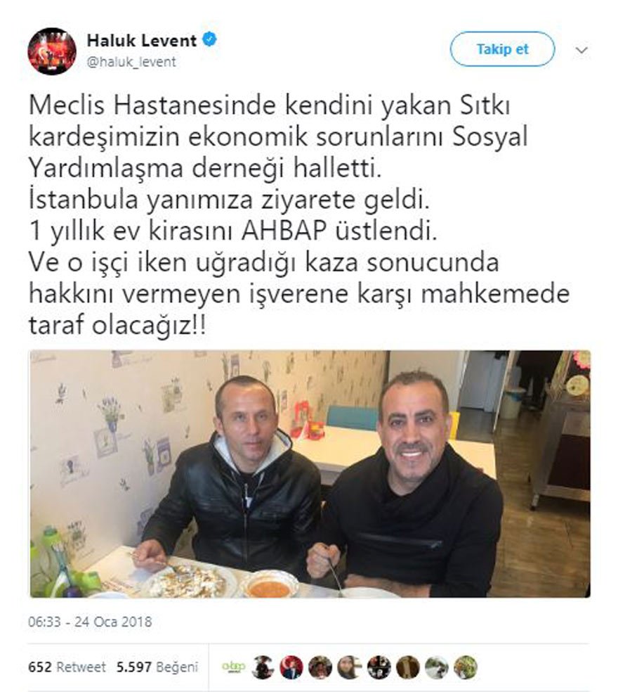 Kafasının bir kısmında yanıklar olduğu belirtilen Sıtkı A.’ya olay sonrası ünlü şarkıcı Haluk Levent ulaştı. Sıtkı A’yı İstanbul’a getiren Haluk Levent işçinin bir yıllık kirasının AHBAP tarafından ödeneceğini ifade etti.