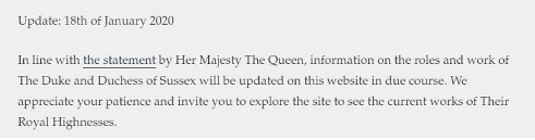 Fakat bu açıklamadan çok kısa bir süre sonra çiftin resmi internet sitesi Sussexroyal.com’da bir açıklama yer aldı. Çiftin “soylu” hayatlarını geride bıraktıkları belirtilirken kendileri hakkında, “Dük hazretleri” anlamına gelen “Their Royal Highness” kavramını kullanması kafaları karıştırdı. Sosyal medyada birçok kullanıcı çiftin halen kendilerini bu unvanla tanıtmalarından rahatsız olduklarını ifade etti. Açıklamada çiftin geçtiğimiz aylarda restore ettirdiği Frogmore Cottage için harcanan 2.4 milyon İngiliz poundunu (yaklaşık 18.4 milyon TL) da geri ödeme sözü verdiği belirtildi. Çift ayrıca o evi kullanmak için kira ödemek zorunda kalacak. İngiliz basınında yer alan iddialara göre çift yıllık 360.000 İngiliz poundu ödeyecek.