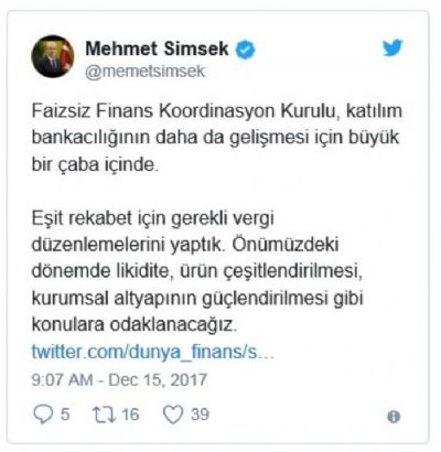 Twitter hesabından yaptığı açıklamada Şimşek, "Faizsiz Finans Koordinasyon Kurulu, katılım bankacılığının daha da gelişmesi için büyük çaba içinde. Eşit rekabet için gerekli vergi düzenlemelerini yaptık. Önümüzdeki dönemde likidite, ürün çeşitlendirilmesi, kurumsal altyapının güçlendirilmesi gibi konulara odaklanacağız" dedi.
