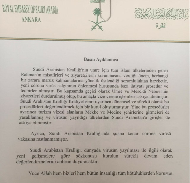 Suudi Arabistan, yeni tip korona virüs (Covid-19) salgını sebebiyle umre ve Mescid-i Nebevi ziyaretlerini geçtiğimiz günlerde askıya aldığını açıklamıştı. Diyanet İşleri Başkanlığı ise yeni umre kaydı alınmayacağını duyurarak, “Suudi Arabistan devleti korona virüs (Covid-19) salgınının önüne geçilmesi maksadıyla tedbir amaçlı umre ziyareti için ülkeye girişlerin geçici olarak askıya alındığını bildirmiştir. Bu kapsamda tüm ülkelerden umre ziyareti için yapılacak girişler geçici olarak durdurulmuştur” açıklamasını yapmıştı.