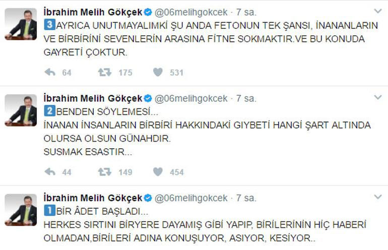 “Bir âdet başladı... Herkes sırtını bir yere dayamış gibi yapıp, birilerinin hiç haberi olmadan,birileri adına konuşuyor, asıyor, kesiyor” diyen Gökçek Twitter’da şunları yazdı: