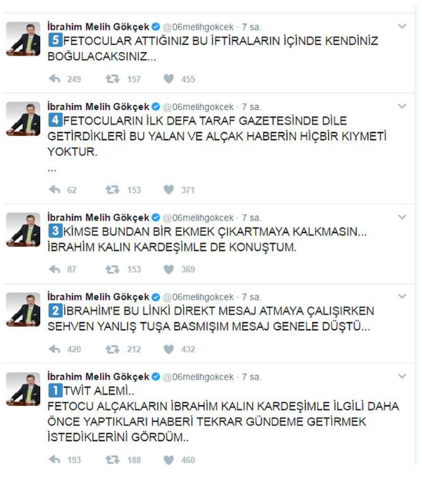 "Twit alemi. Fetocu alçakların İbrahim Kalın kardeşimle ilgili daha önce yaptıkları haberi tekrar gündeme getirmek istediklerini gördüm. İbrahim'e bu linki direkt mesaj atmaya çalışırken sehven yanlış tuşa basmışım mesaj genele düştü... Kimse bundan bir ekmek çıkartmaya kalkmasın... İbrahim Kalın kardeşimle de konuştum. Fetocuların ilk defa Taraf gazetesinde dile getirdikleri bu yalan ve alçak haberin hiçbir kıymeti yoktur. Fetocular attığınız bu iftiraların içinde kendiniz boğulacaksınız..."