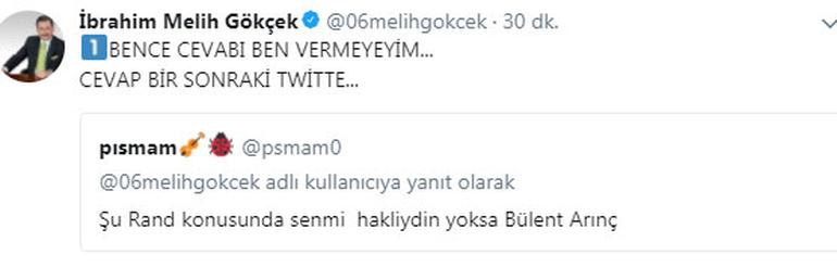 Melih Gökçek, "Şu rant konusunda sen mi haklıydın yoksa Bülent Arınç mı" şeklindeki bir tweeti paylaştı ve "Bence cevabı ben vermeyeyim cevap bir sonraki twitte" diye yazdı. Gökçek, daha sonra Bülent Arınç'ın 3 ayrı konuşmasından birleştirilen bir videoyu paylaştı.