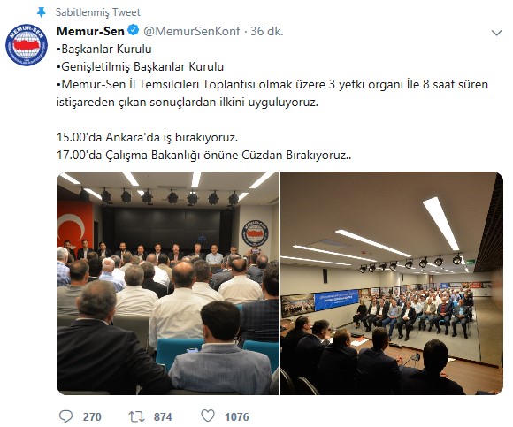 Memur-Sen'in twitter hesabından yapılan açıklamada, "Başkanlar Kurulu, Genişletilmiş Başkanlar Kurulu, Memur-Sen İl Temsilcileri Toplantısı olmak üzere 3 yetki organı İle 8 saat süren istişareden çıkan sonuçlardan ilkini uyguluyoruz. 15.00'da Ankara'da iş bırakıyoruz. 17.00'da Çalışma Bakanlığı önüne Cüzdan Bırakıyoruz." denildi.