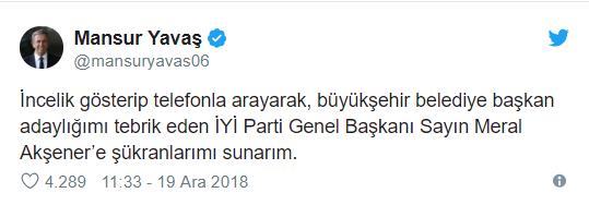 Yavaş, "İncelik gösterip telefonla arayarak, büyükşehir belediye başkan adaylığımı tebrik eden İYİ Parti Genel Başkanı Sayın Meral Akşener´e şükranlarımı sunarım" dedi.