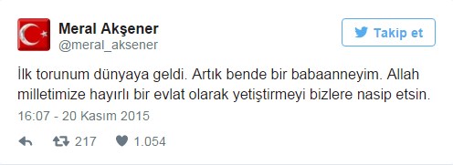 Akşener, mutluluğunu "İlk torunum dünyaya geldi. Artık ben de bir babaanneyim. Allah milletimize hayırlı bir evlat olarak yetiştirmeyi bizlere nasip etsin." diyerek takipçileriyle paylaştı.