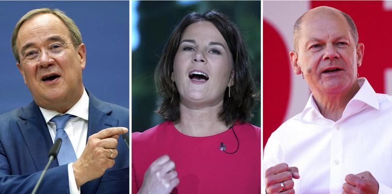 Hristiyan Demokrat Birliği'nin (CDU) adayı Armin Laschet (sağda), Yeşiller adayı Annalena Baerbock ve Sosyal Demokrat Parti'nin (SPD) lideri Olaf Scholz (sağda)