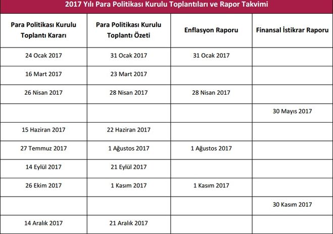 Türkiye Cumhuriyet Merkez Bankası (TCMB), 2017 yılı Para Politikası Kurulu (PPK) toplantılarının 16 Mart, 26 Nisan, 15 Haziran, 27 Temmuz, 14 Eylül, 26 Ekim ve 14 Aralık tarihlerinde yapılacağını duyurdu.