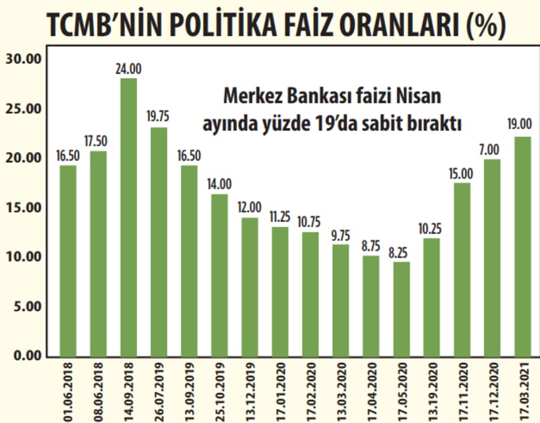 TCMB, Ocak ve Şubat aylarında faizi beklendiği gibi yüzde 17,00 seviyesinde tutmuştu. Geçtiğimiz ay 100 baz puanlık faiz artırım beklentisine karşın, Merkez Bankası 200 baz puanlık artırım kararı ile faiz yüzde 19,00'a yükseltilmişti.