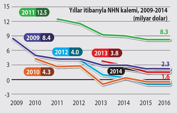 Ödemeler dengesi verisinin 6 haftada bir yayımlandığı belirtilen raporda, bu sürenin uluslararası uygulamalara göre oldukça kısa olduğu ifade edildi. Oysa Turizm ve Bavul Anketleri ile Uluslararası Ödemeler Bankası’nın verilerinin üç ay gecikmeli yayımlandığı kaydedilen raporda, bu durumun da erken açıklanan verilerde NHN’nin yüksek çıkmasına yol açtığı kaydedildi. Kesin veriler geldikçe güncelleme yapıldığı belirtilen rapora göre, 2009’da artı 8.4 milyar dolar olan NHN, güncellemeyle 2016’da 2.3 milyar dolara indi.