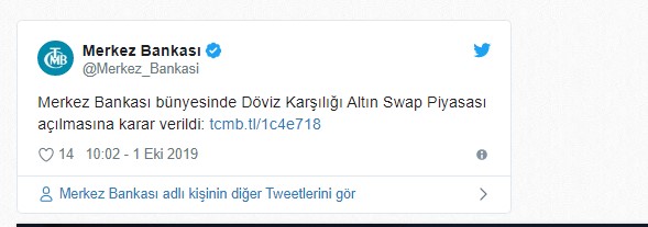 Merkez Bankası, "Bankaların likidite yönetimdeki etkinliğin artırılması amacıyla Merkez Bankası bünyesinde Döviz Karşılığı Altın Swap Piyasasının açılmasına karar verilmiştir." açıklamasında bulundu.
