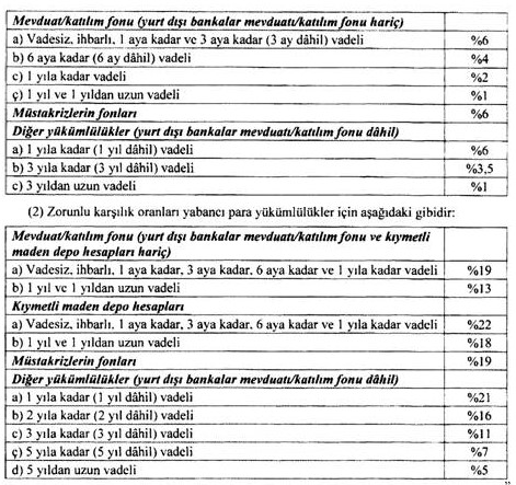 Buna göre, Türk lirası zorunlu karşılık oranı, vadesiz, 1 ay ve 3 aya kadar vadeli hesaplar için yüzde 4'ten yüzde 6'ya çıkarıldı. Yabancı parada ise vadesiz ve 1 yıla kadar vadeli hesaplarda yüzde 17'den 19'a yükseltildi.