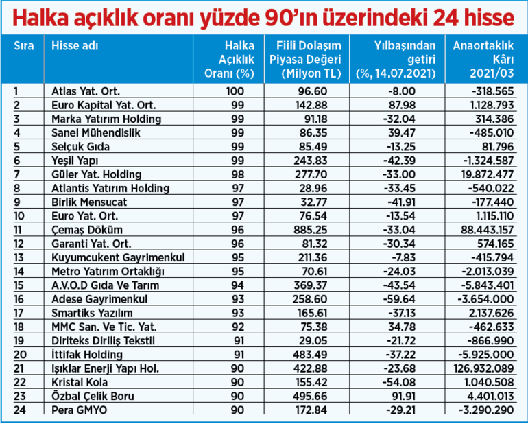 Borsada işlem gören şirketlerin 24 tanesinin fiili dolaşımdaki payları yüzde 90’ın üzerinde. Bu firmalardan 5’i yatırım ortaklığı olurken kalan 19 şirket farklı sektörlere dağılmış durumda. Bu hisselerden 4’ü dışında hepsi yılbaşından bu yana değer kaybetti. Firmaların kârlılıklarına bakıldığındaysa yılın ilk 3 ayında 24 şirketin 13’ü zarar açıkladığı gözleniyor. Zarar üreten firmaların kâra geçememesi halinde hissedarların kazanç elde etme imkânının azalacağı göz ardı edilmemeli.