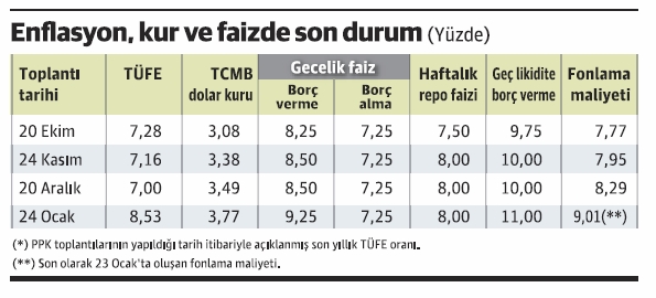 Merkez Bankası Para Politikası Kurulu gecelik borç verme faizini 0.75 puan artırarak yüzde 8.50'den yüzde 9.25'e, geç likidite penceresinden verdiği borcun faizini de 1 puan artırarak yüzde 10'dan yüzde 11'e çıkardı. Yüzde 7.25 olan gecelik borç alma faiziyle yüzde 8 olan haftalık repo ihale faiz oranında değişikliğe gidilmedi.