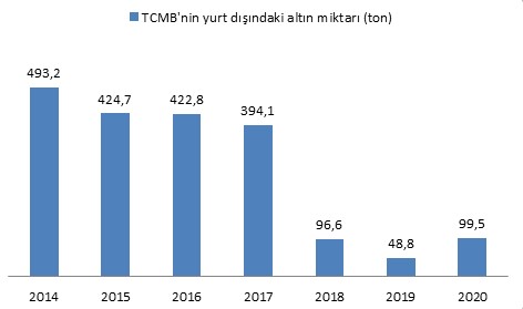 2014 yılında TCMB'nin yurt dışında 493,2 ton altını varken, bu rakam 2019'da 48,8 tona kadar geriledikten sonra 2020 sonunda 99,5 tona yükseldi.